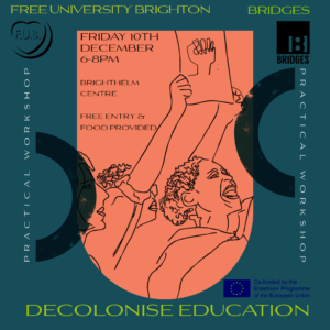The first workshop looks at the idea of decolonising education. FUB is co-hosting this with BRIDGES, a project that has developed a set of tools for how to begin to understand and change educational practice. This will be held on Friday 10th December at the Brighthelm Centre, from 6pm – 8pm. We will be providing free food at the event so don’t worry if you have to miss dinner time, we’ll have you covered. Sign up on our events page here if you can, so we know how many are coming along and how many to cater for. Share the details, and share some of the graphics we’ve made below on social media (right click and download the image and then share on your Facebook/Twitter/TikTok/Insta).